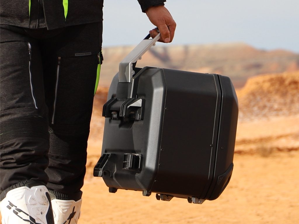 Unikátní integrovaný mechanismus zámku a madla umožňuje jednoduché ovládání jednou rukou a snadnou demontáž z motocyklu.