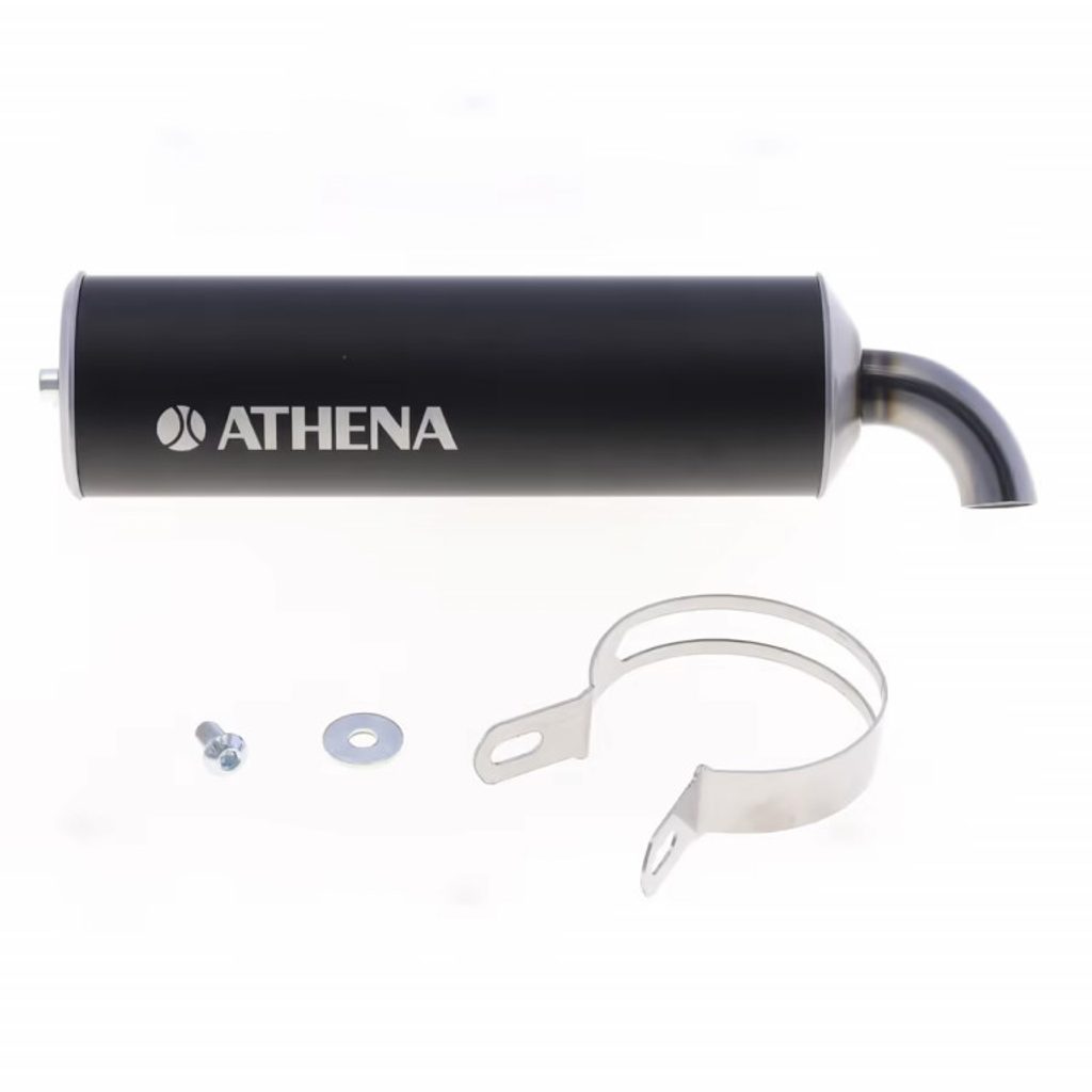 Černý hliníkový tlumič výfuku Athena je navržen pro odolnost, nízkou hmotnost a optimální výkon. S průměrem 70 mm a délkou 250 mm zajišťuje lepší pohlcování zvuku při zachování efektivního odtoku výfukových plynů.
