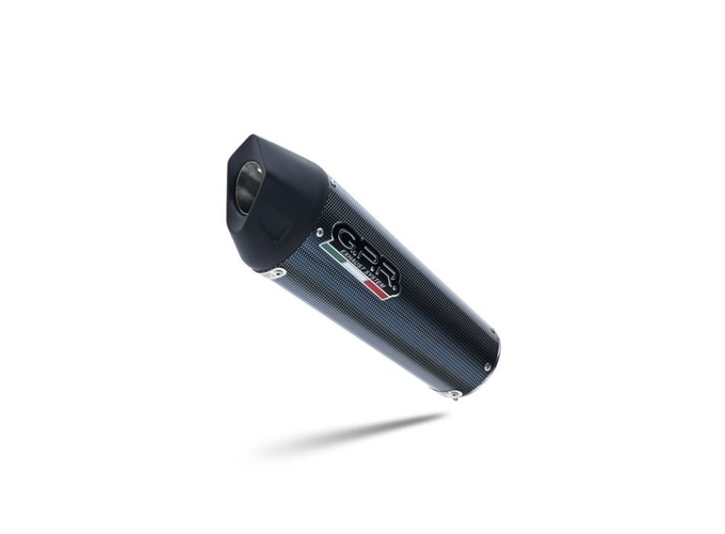 Tlumič výfuku má kuželovitý tvar se speciální geometrií, která začíná průměrem 90 mm a rozšiřuje se až na 130 mm v obvodu; jeho délka se liší podle typu motocyklu. Má tělo z nerezové oceli s povrchovou úpravou imitující karbon, nerezové koncovky vyrobené CNC obráběním a pětiúhelníkový výstup s dB killerem. Kulatý kuželový tvar má rozměry 390 × 130 mm.