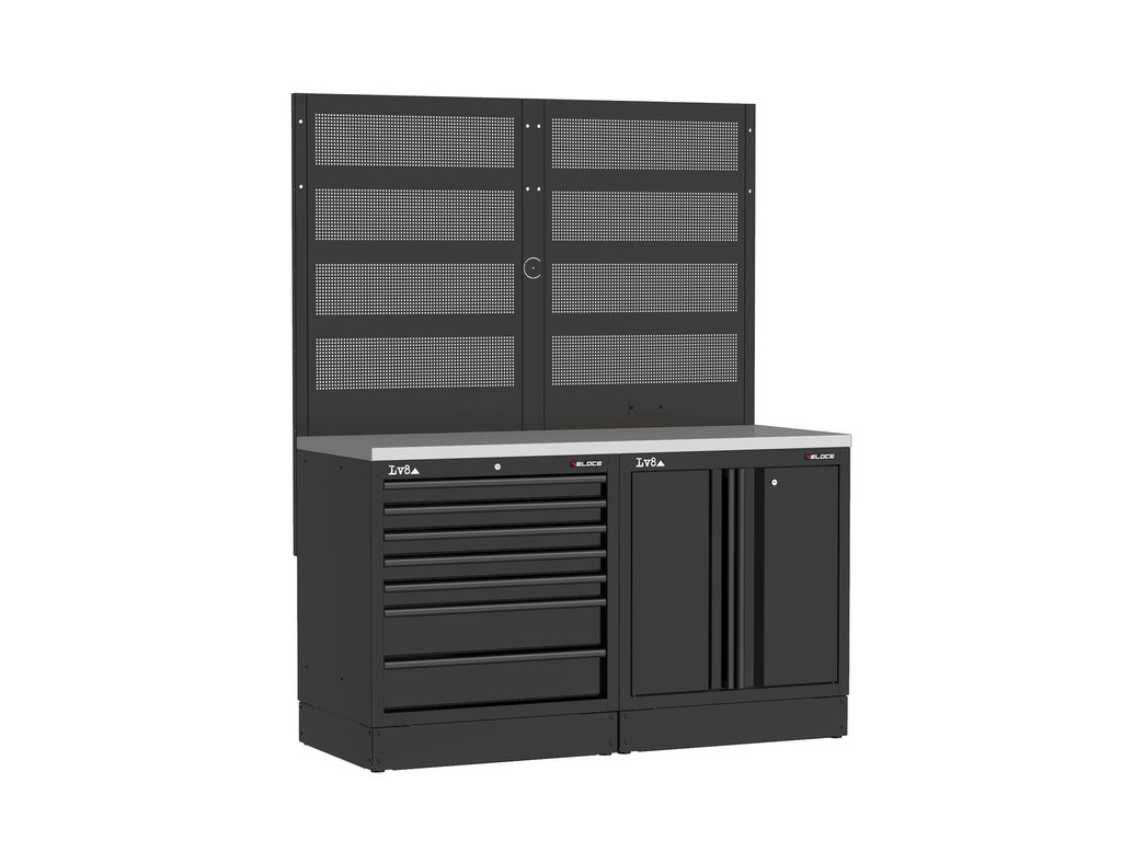 Pracovní stůl délky 1600 mm s 7 zásuvkovou skříňkou a dvoudveřovou skříňkou s nastavitelnou policí a zámkem. Masivní dřevěná pracovní deska, dvojitý perforovaný panel na nářadí a příprava pro elektrickou zásuvku. K dispozici také v provedení s nerezovou nebo melaminovou deskou.