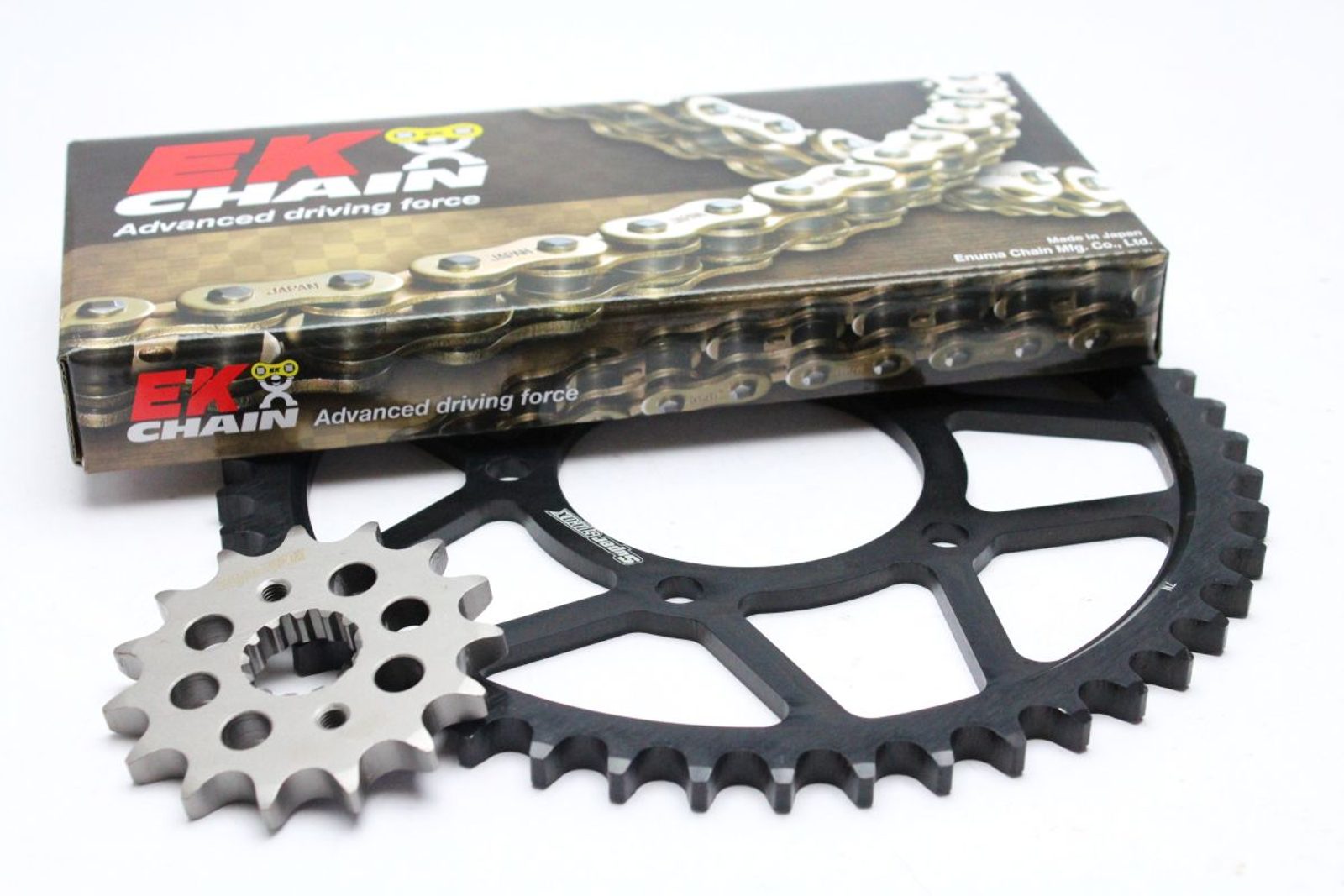 Řetězy EK vyrábí japonská firma Enuma Chain již od druhé světové války. Ano, takhle dlouho. Ke všemu, co dělají, přistupují s pověstnou japonskou precizností a zároveň nepřestávají inovovat. Přišli například jako první s těsněním řetězu O-kroužkem, který prodlužuje životnost řetězu až o 50 % oproti netěsněnému řetězu. Poměrně novinkou je i technologie ZST. Díky ní nemusíte opakovaně napínat řetěz během záběhu = cca prvního tisíce kilometrů.