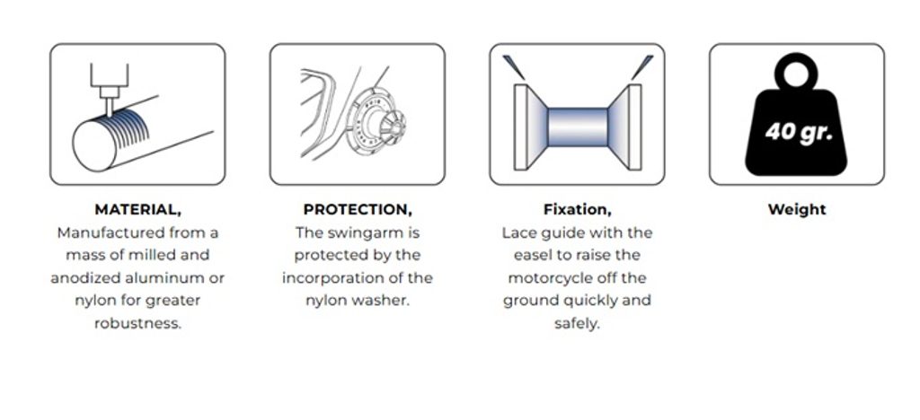 Rolka (spool) slouží jako vodicí prvek pro použití montážního stojanu a umožňuje snadné, rychlé a bezpečné zvednutí motocyklu. V tomto případě představujeme model Spool Pro od Puig. Je vyroben z eloxovaného hliníkového bloku (s nízkou hmotností pouhých 32 g) a díky černé nylonové podložce s vyrytým označením Puig Hi-Tech Parts zajišťuje ochranu kyvné vidlice před možným poškrábáním.