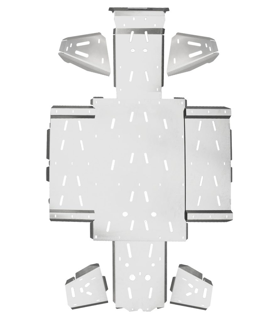 Kompletní kryty podvozku Shark Accessories, odolná ochrana spodní části UTV, z anodizovaného a lehkého 4 mm hliníku letecké kvality, montážní otvory pro snadnou údržbu, výřezy pro snadnější čištění čtyřkolky, včetně integrovaných krytů nášlapů, nízká hmotnost, snadná montáž