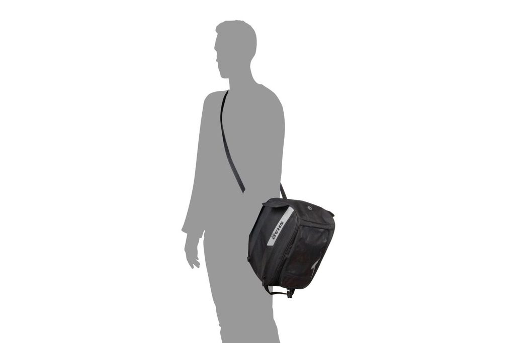 Taška pro skútr SC25 do prostoru mezi nohy je vybavena 2 postranními kapsami a vejde se do ní přilba. V horní části naleznete průhlednou dotykovou kapsu, do které můžete vložit mapy, tablet nebo GPS.