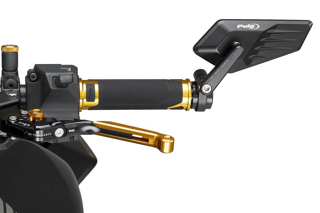 Neschválené zpětné zrcátko je navrženo k montáži na konec řídítek a nabízí funkční i estetické řešení, které se dokonale integruje s liniemi motocyklu. Ve srovnání s aktuálními modely přináší novou úroveň nastavení, která výrazně zlepšuje přizpůsobení individuálním preferencím jezdce. Tento systém umožňuje naklopení ramene zrcátka pro přesnější nastavení úhlu pohledu, přičemž zachovává možnost rotace vzhledem k řídítkům pro správnou orientaci. Konečné doladění je dosaženo prostřednictvím vysoce přesného kuličkového kloubu, který umožňuje jemné a bezpečné nastavení, zajišťuje stabilitu při jízdě a zabraňuje nežádoucím pohybům způsobeným vibracemi.